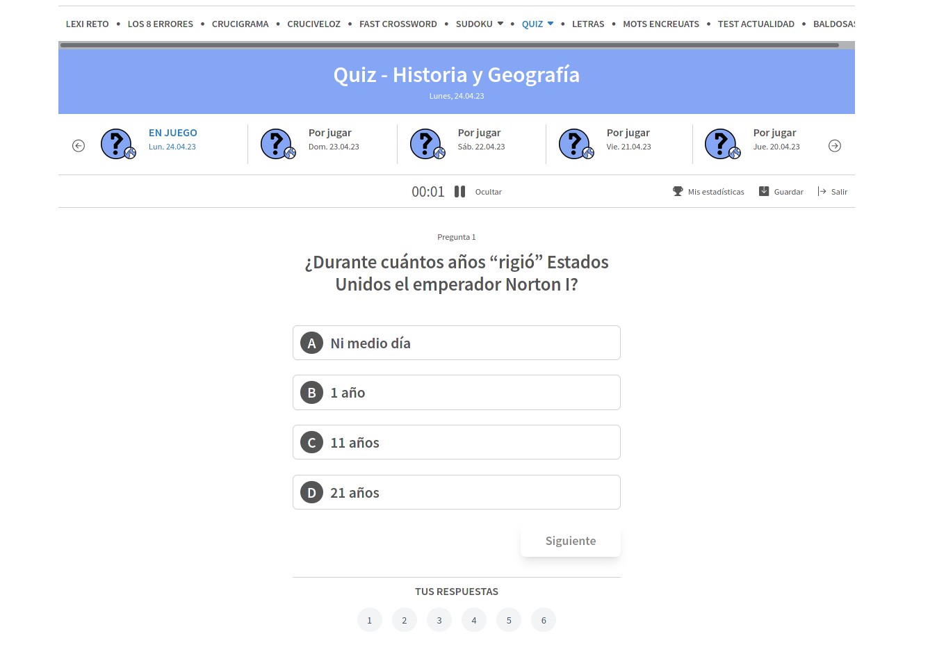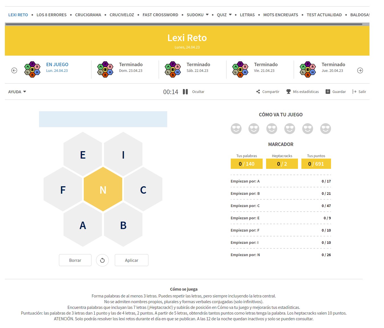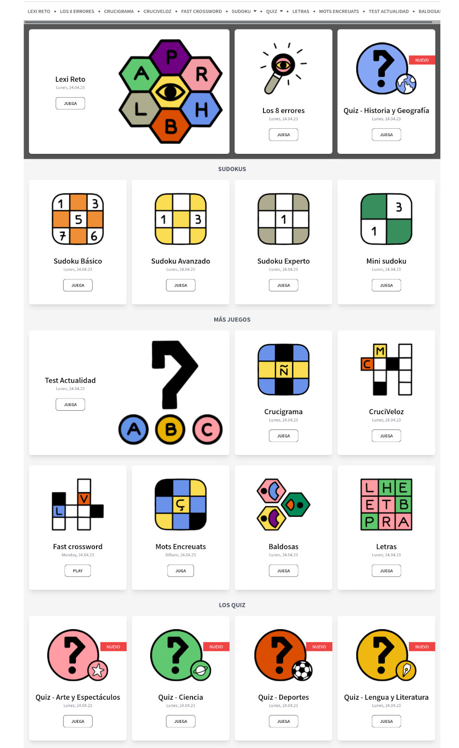 - Administración de juegos: Crucigrama, Letras conectadas, Diferencias, Test actualidad, Quiz, LexiReto